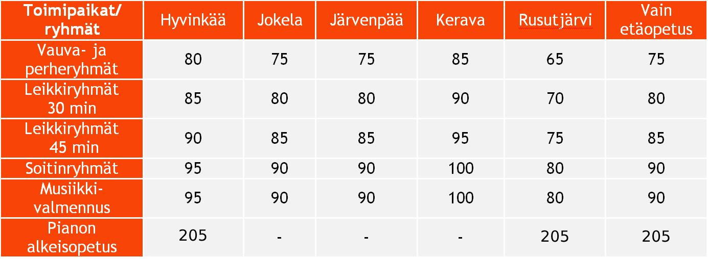 Lukukausimaksuun sisältyy 15 varhaisiän musiikinopettajan suunnittelemaa ja yhdessä osallistujien kanssa toteuttamaa tuntia materiaaleineen.